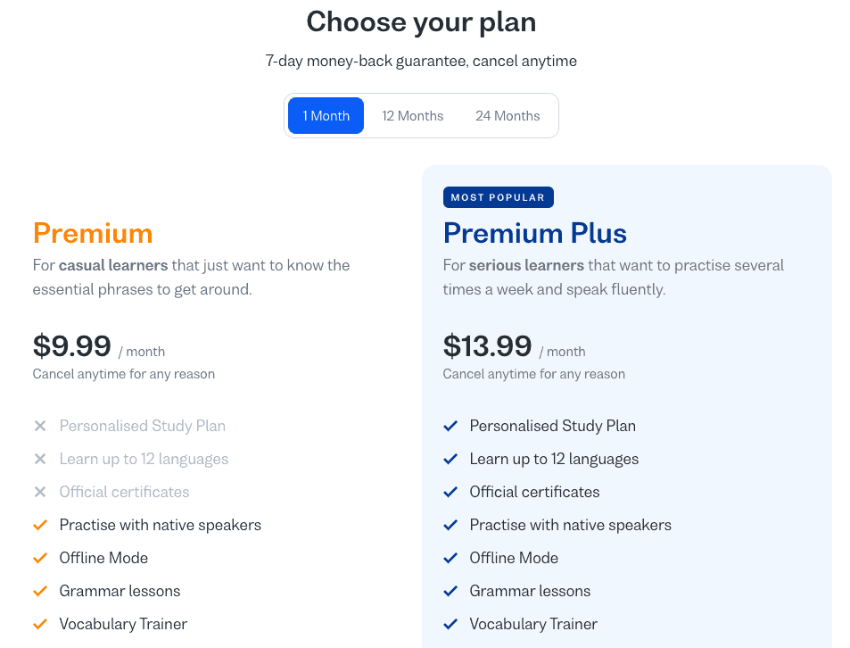 Giá của Busuu Premium phụ thuộc vào thời gian đăng ký mà bạn chọn: