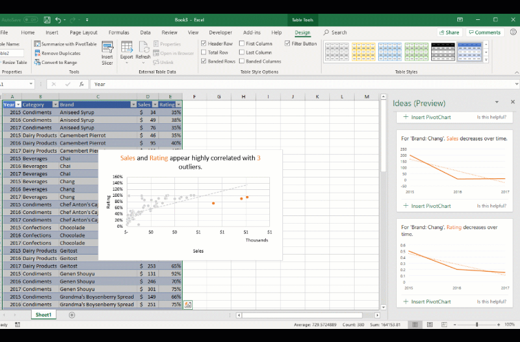 • Excel Ideas: Tính năng này sử dụng trí tuệ nhân tạo để phân tích dữ liệu của bạn và đưa ra các đề xuất về biểu đồ, bảng xoay, hoặc các công thức có thể hữu ích. Bạn chỉ cần chọn một phạm vi dữ liệu, nhấp vào “Ideas” và Excel sẽ tự động tạo ra các biểu đồ trực quan và gợi ý các phân tích tiềm năng.