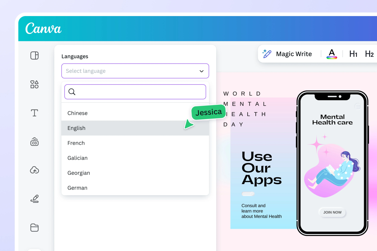 Một điểm cộng cực lớn của Canva AI chính là sự đa dạng trong lựa chọn giọng đọc. Bạn có thể chọn từ hơn 120 giọng AI, hỗ trợ trên 20 ngôn ngữ khác nhau. Không chỉ có tiếng Anh chuẩn, bạn còn có thể chọn tiếng Việt với các accent miền Bắc, Trung, Nam, hoặc giọng Anh – Mỹ, Anh – Úc, Pháp, Nhật Bản,…