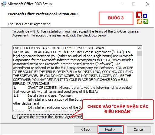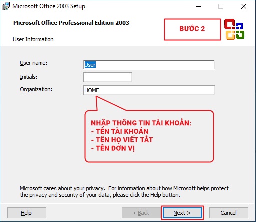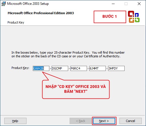 Bước 1: Nhập CD KEY Office 2003 và bấm Next