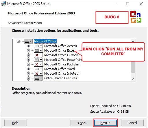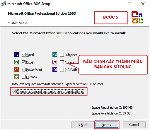 Bước 5: Chỉ lựa chọn các thành phần Office 2003 mà bạn sử dụng nhằm tiết kiệm tài nguyên máy tính