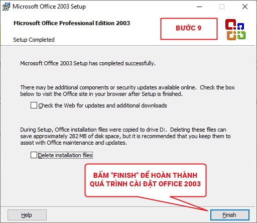 Bước 9: Bấm Finish để hoàn thành cài đặt Office 2003