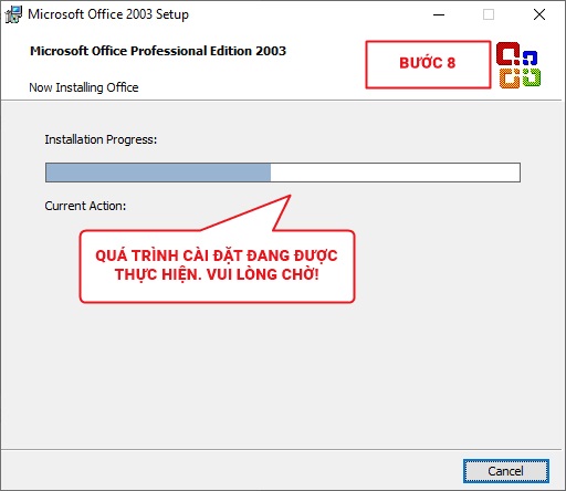 Bước 8: Quá trình cài đặt Office 2003 đang được thực hiện. Vui lòng chờ!