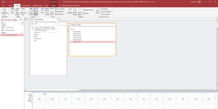 • Bước 1: Tiến hành mở công cụ Query Design > tiếp đến chọn Create sau đó chọn vào Tiếp tục thiết kế truy vấn.