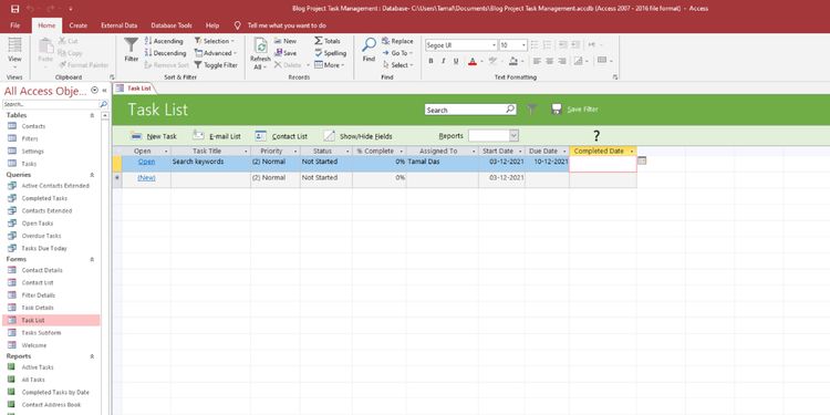 Bước 5: Tại giao diện của mẫu, ngăn bên trái chính là Task List, hiển thị danh sách mọi đối tượng mọi cơ sở dữ liệu sẵn có như bảng, truy vấn, biểu mẫu,…Bạn có thể tuỳ chọn và nhấn vào một loại đối tượng để bắt đầu quản lý dự án của mình. Sau đó nhấn vào New Task