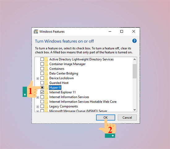 • Control Panel: Trong Control Panel, chọn Programs, sau đó chọn Turn Windows features on or off. Tìm mục Hyper-V, đánh dấu chọn và nhấn OK.