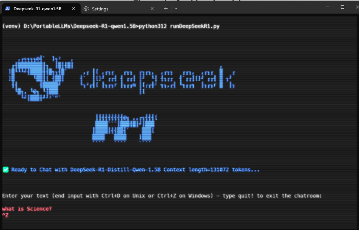 Nếu quá trình chạy thành công, bạn sẽ thấy giao diện command-line của DeepSeek, sẵn sàng để nhập dữ liệu đầu vào và xử lý.