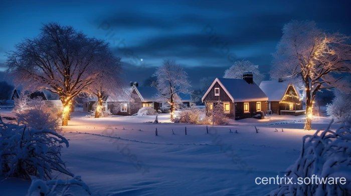 Ví dụ trên là một bức tranh phong cảnh tuyết trắng với một làng nhỏ và rừng thông được tạo ra từ kết hợp nhiều khái niệm chi tiết như “làng nhỏ giữa rừng thông, tuyết rơi dày, ánh sáng mờ ảo của hoàng hôn, khói bốc lên từ các ngôi nhà,…”.