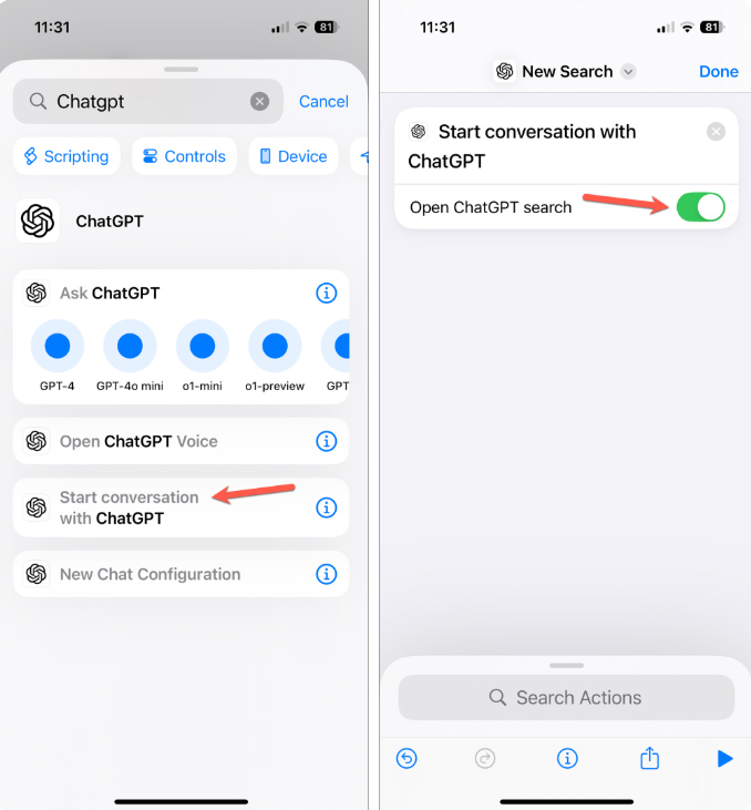 🔹 Nếu bạn sử dụng ChatGPT Plus hoặc ChatGPT Team, hãy tìm kiếm từ khóa “ChatGPT” trong Shortcuts để có thêm nhiều tùy chọn như bắt đầu trò chuyện hoặc tìm kiếm nhanh.