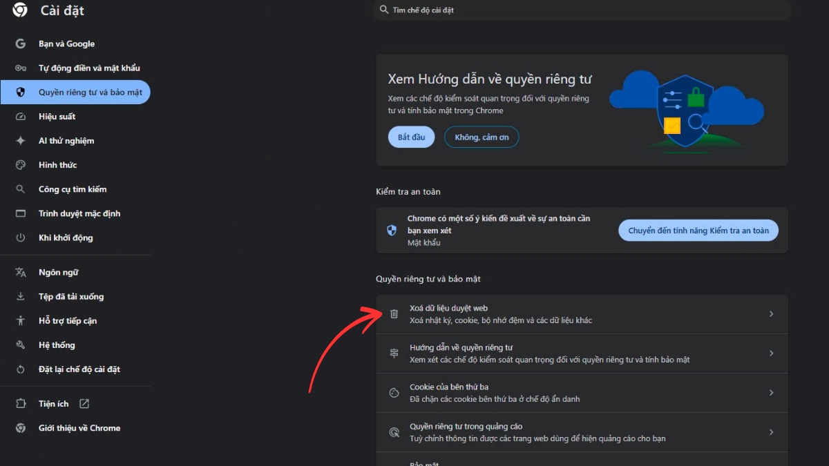 • Chrome: Cài đặt > Quyền riêng tư & bảo mật > Xoá dữ liệu duyệt web