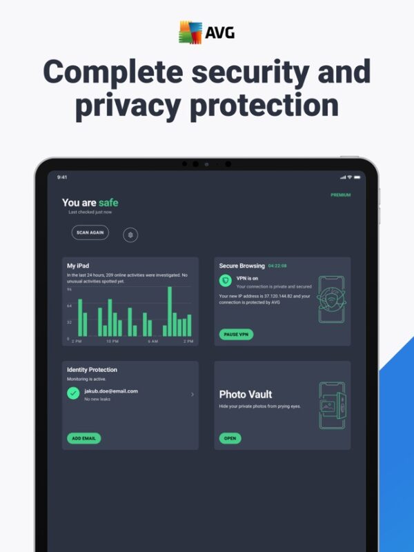 • AVG Secure VPN: Bảo vệ quyền riêng tư trực tuyến của bạn bằng cách mã hóa lưu lượng truy cập internet của bạn.