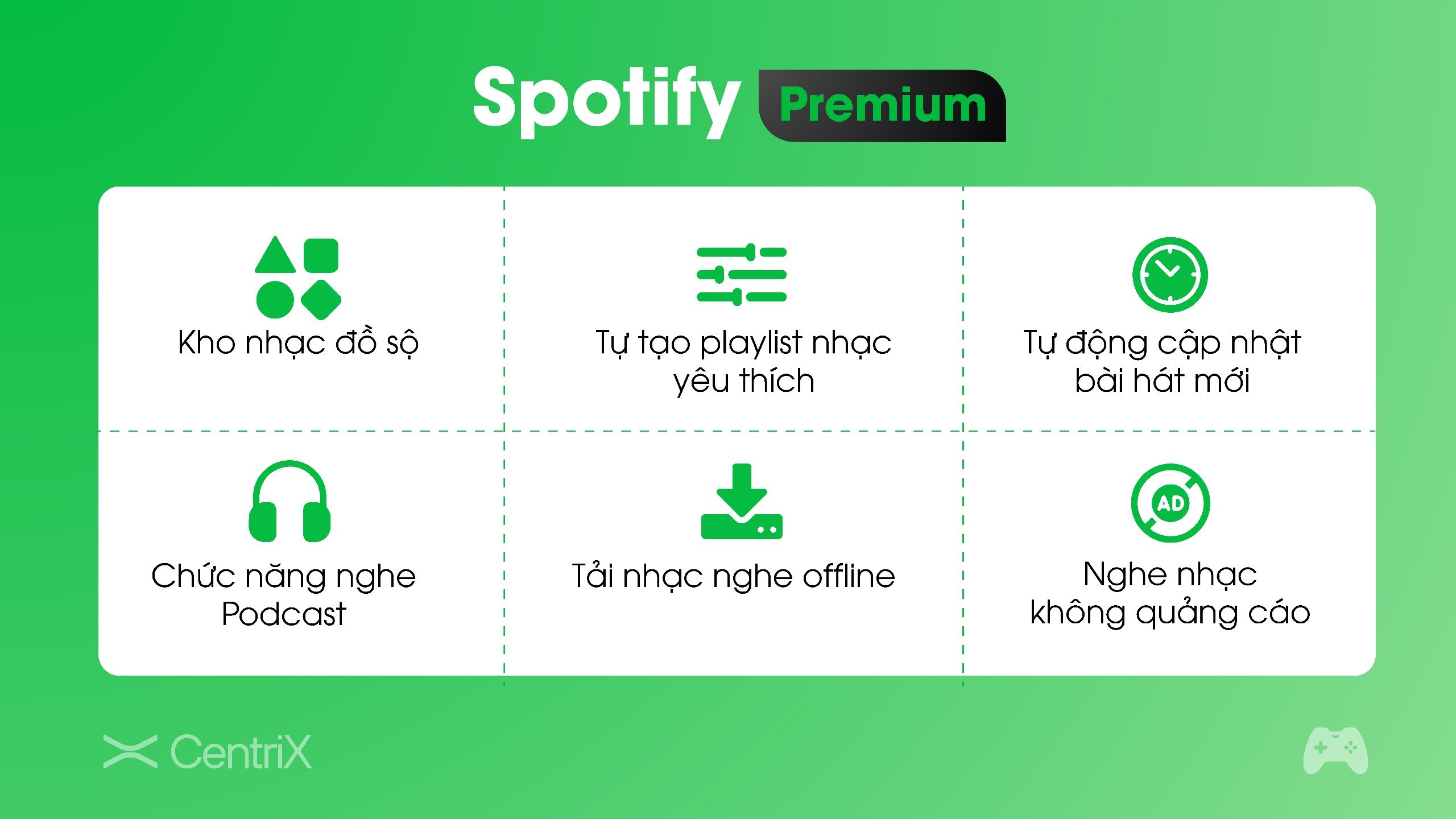 Đắm mình trong thế giới âm nhạc không giới hạn với tài khoản Spotify Premium chính chủ 1 năm của chúng tôi. Không quảng cáo, chất lượng âm thanh tuyệt hảo, và khả năng tải nhạc về nghe offline sẽ mang lại trải nghiệm nghe nhạc tuyệt vời cho bạn.