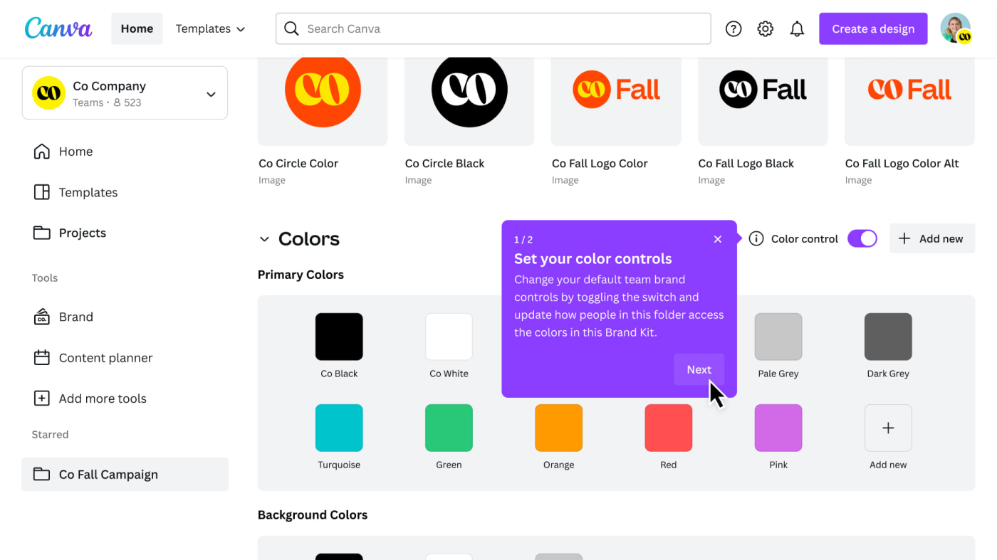 • Canva tự động hiển thị bảng màu và font chữ đã thiết lập trong Brand Kit khi bạn bắt đầu thiết kế mới.
