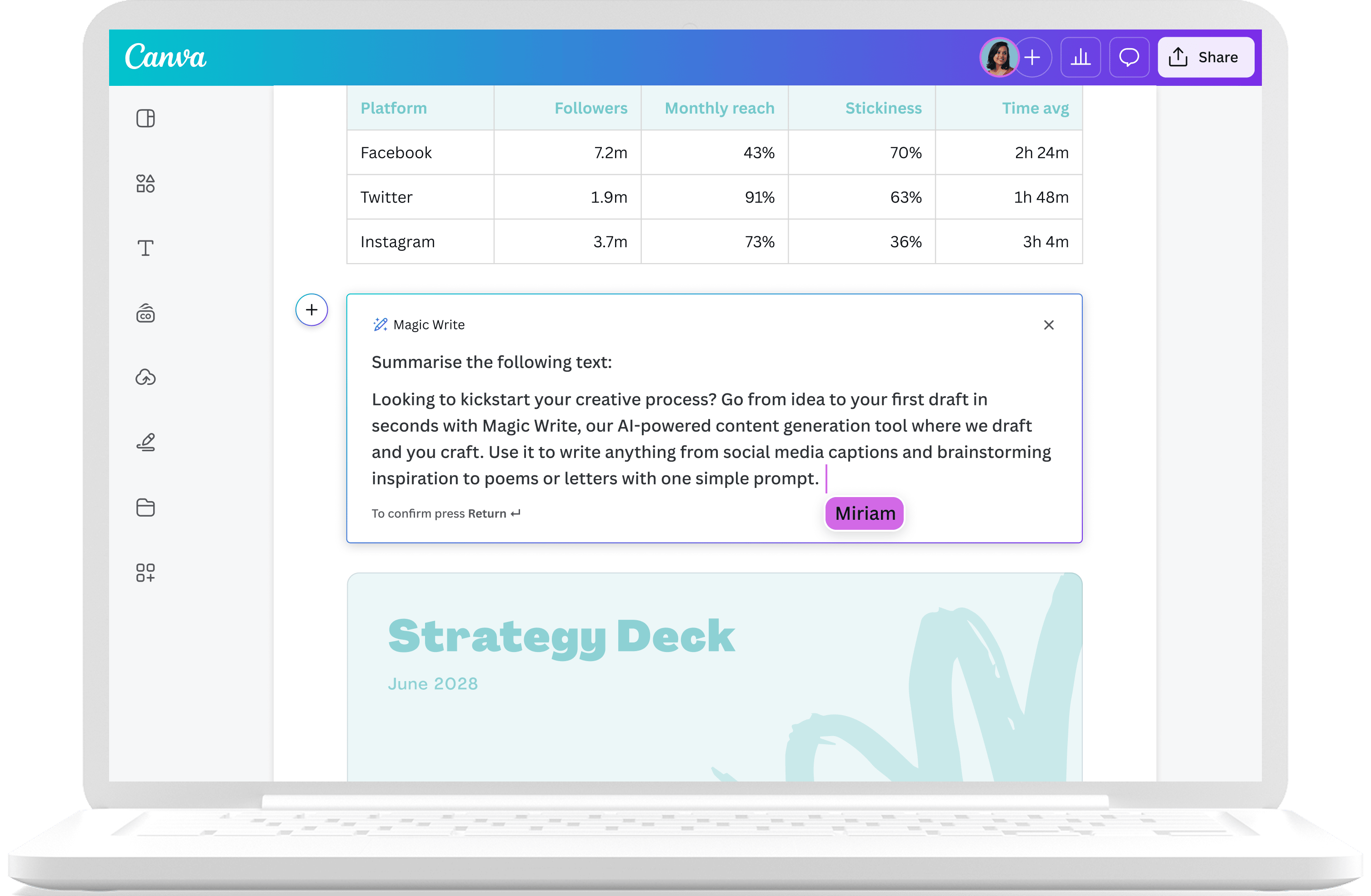 • Tiết kiệm thời gian: Chỉ cần nhập yêu cầu, Magic Write sẽ gợi ý nội dung hoàn chỉnh trong vài giây.