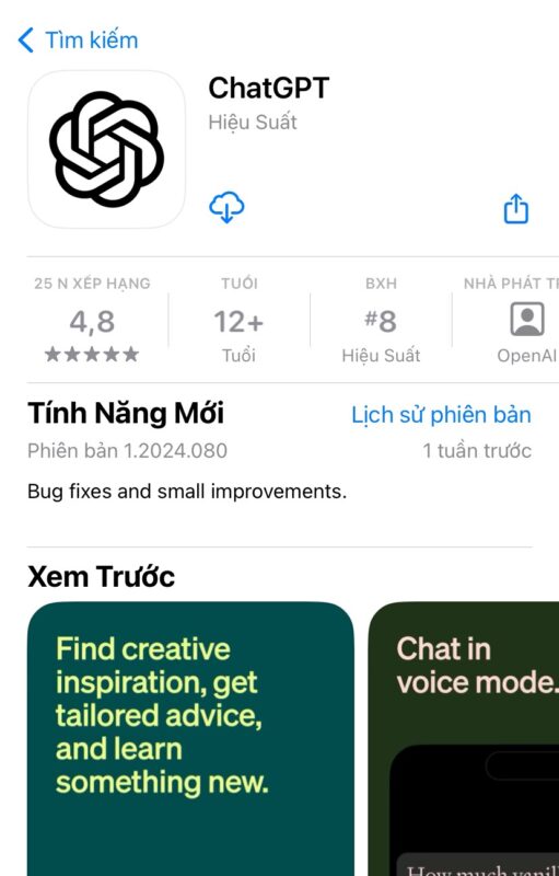 Bước 4: Tải và cài đặt ứng dụng: Trên trang chi tiết của ứng dụng ChatGPT, bạn sẽ thấy nút “Tải xuống” (hoặc “Cài đặt” nếu bạn đã tải ứng dụng này trước đó). Nhấn vào nút này để bắt đầu quá trình tải xuống và cài đặt.